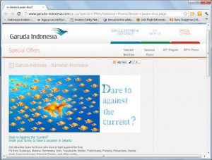 As one of major airlines in Indonesia with international coverage and deals straightly with international customers, I found Garuda’s error in English caught my attention. “Dare to against the current” seems awkward to me. I’d rather prefer “Dare to go against the current” over “Dare to against the current”. So, before thinking about getting into SkyTeam and be one of 5-star airlines, why don’t Garuda improve their English first?