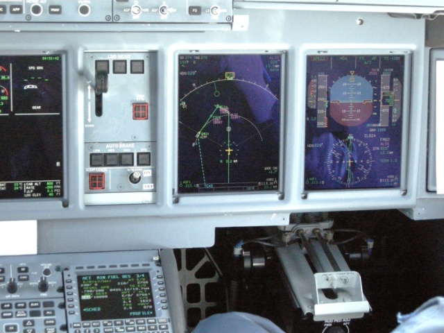 Kita bisa melihat bahwa pesawat sedang terbang dengan heading 029°, bekecepatan 238 knot indicated airspeed, pada ketinggian 7200 kaki, dengan posisi sekitar 10 nautical miles dan arah sudut kira 150° dari Halim. Waypoint berikut yang ada di FMC (Flight Management Computer) adalah AL01, sebuah pseudo-waypoint (dari AL 150° dengan jarak sekitar 3 nautical mile) yang berjarak sekitar 10.1 nautical miles dari pesawat ketika foto diambil. AL01 ini dibuat agar pesawat dapat belok secara mulus ke non-directional beacon bernama AL, untuk kemudian melakukan ILS approach ke runway 24. Terlihat juga bahwa autopilot sedang menyala dan menggunakan modus Heading Select, Speed Select, dan Vertical Speed Select (029°, 230 knots, -1300 feet per minute), dengan Altitude Select (seleksi ketinggian) di 6000 kaki. Sudut kiri atas Navigation Display memperlihatkan angin dari arah 150° dengan kecepatan 8 knot, ground speed 274 knot, dan true airspeed 270 knot. Kotak oranye yang mengelilingi tulisan “SPEED” menandakan bahwa kecepatan pesawat melebihi yang diseleksi dan sistim autothrust sudah memerintahkan idle thrust.